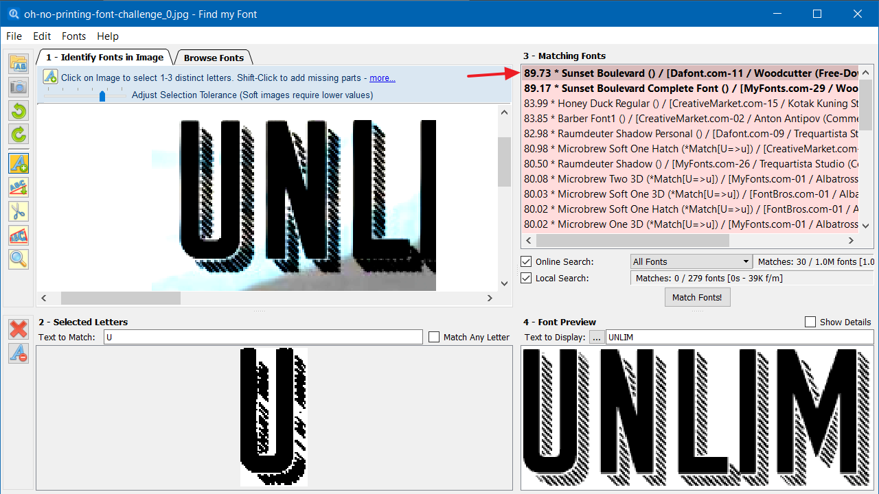 | Hi, This image is both fascinating and quite challenging when it comes to font identification. A key thing to remember is that the letter you choose for matching needs to be distinctive and should include all of the visual components that make the font unique. In this case, selecting just one letter is actually enough—any of them would work. I chose the first “U”, because its shape is very unusual and appears in only a handful of typefaces. The real challenge was selecting all the parts of the character, including the fine shadow lines. At first, I tried selecting the primary glyph and then, while holding Shift, manually adding the shadow strokes. This was extremely tedious, and the tiniest mouse slip would accidentally grab a chunk of background—forcing me to clear everything and start over. To make this easier, I used a smarter approach: the contrast tool. I selected the first three letters and opened the deformation tool. Then I pushed the contrast all the way to the right. This thickened the shadow lines, and in some areas even connected them, which made the selection process much easier. After just a few clicks, most of the shadow was captured cleanly. From there, I simply specified that the letter was “U”, clicked Match Fonts, and voilà— the top result was Sunset Boulevard. Harris Kisseoglou Operations Manager Softonium Developments |