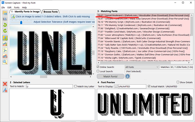 | "Exotic" fonts have usually more distinct letters and are easier to match, but sometimes is a bit tricky to select the appropriate letters. I selected just the first letter of your image and as you can see the first match in the list is the correct font. Some rules: 1. Try to select as many details as possible by adding parts of the letter one by one by Ctrl-click 2. There is no need to select ALL details, as long as you select some of them at the letter image boundaries 3. Adding black background, inverting the image or selecting a much bigger image of the original letter does not help at all, in fact it destroys the matching accuracy of Find my Font I hope that helps a bit! Fivos Vilanakis - Softonium Developments CTO |